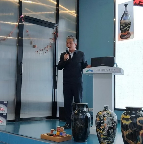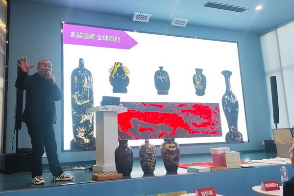 作为论坛的文化亮点,书法家王炳尧现场创作并赠予“伟岸中华”书法作品,该作品蕴含四层深刻内涵,既暗合论坛举办的日期与地点,又寄托了对祖国繁荣昌盛、与会者身心健康的美好祝愿,其丰富的文化底蕴赢得了现场嘉宾的高度赞誉。此外,国家一级美术师傅继英赠予“一马当先”书法作品,书画家何茂卓赠予“观海听涛”书法作品,为活动增添了浓厚的艺术氛围。景德镇陶瓷历史文化研究会副会长余建华现场展示并解读黑白陶艺作品,让与会者感受到传统陶瓷文化与现代创意的完美融合。
